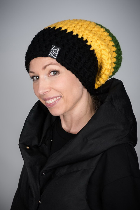 Czapka DREADLOVE RASTA to wielokolorowa, ręcznie robiona czapka na dready, z motywem rasta. Dedykowana wszystkim miłośnikom rytmów reggae.Do jej wykonania użyto wysokiej jakości włóczki, co czyni ją miękką i miłą w dotyku. Czapka jest długa, mięsista i ażurowa. Mieści nawet bardzo długie dready i warkoczyki. Na krawędzi dodatkowo wszyta jest gumka, która utrzymuje ciężar włosów. Gruby luźny splot sprawia, że czapka świetnie się układa i oddycha.